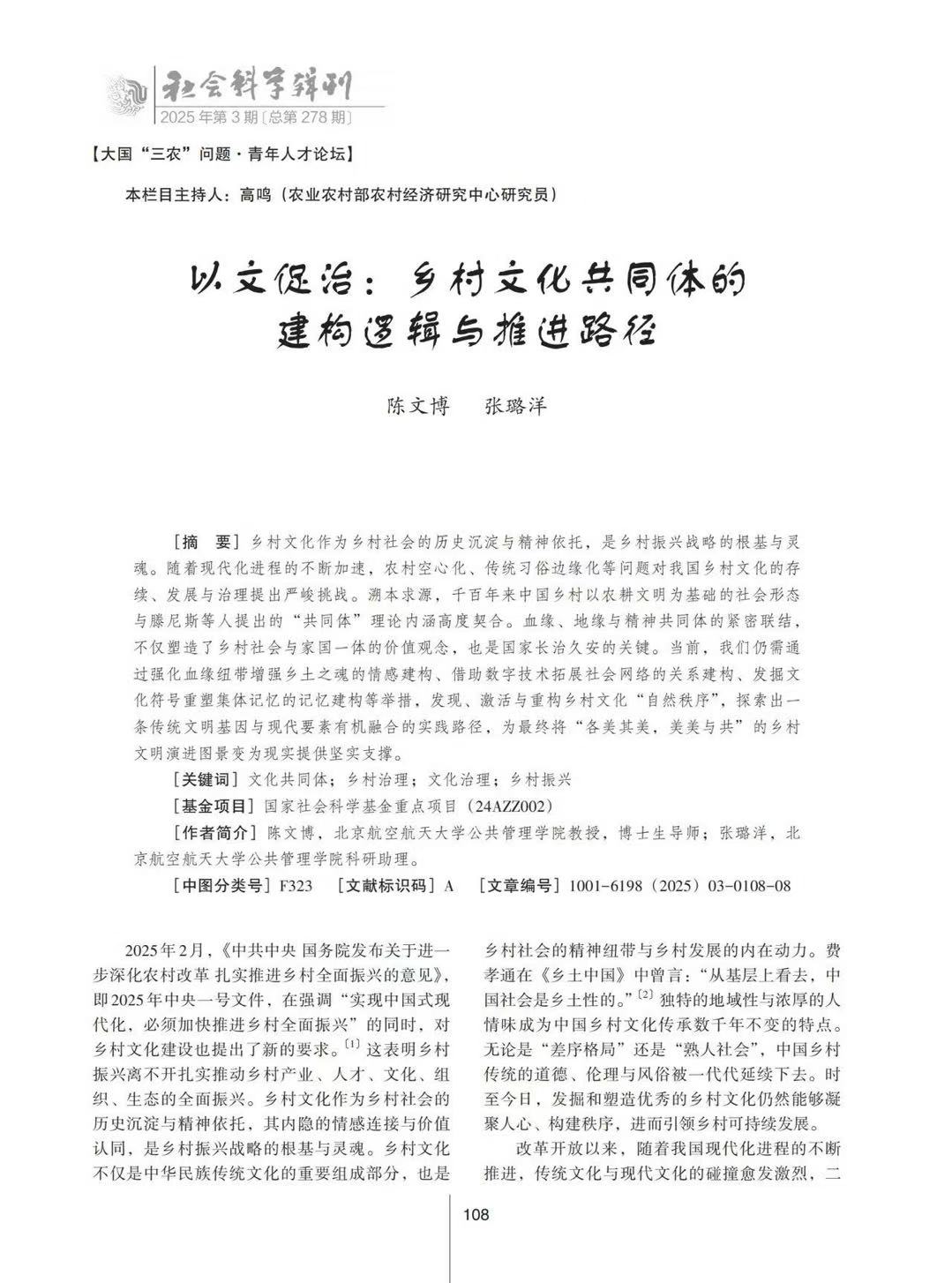 近日,北京航空航天大學人文社會科學學院(公共管理學院)陳文博教授、科研助理張璐洋在《社會科學輯刊》so米體育-NBAso米直播第3期發表《以文促治:鄉村文化共同體的建構邏輯與推進路徑》一文
